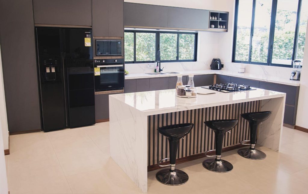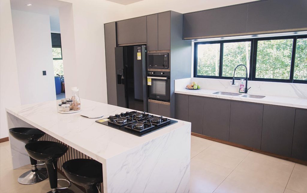 El sistema de apertura de puertas sin manijas hace parte de las tendencias actuales y otorga al espacio una especial sensación de pulcritud y minimalismo. El proceso de refrigerar, alistar y cocinar se puede realizar con practicidad gracias a la disposición inteligente de las áreas de trabajo. La Nevera, el lavaplatos y la estufa están ubicados pensando en su comodidad.