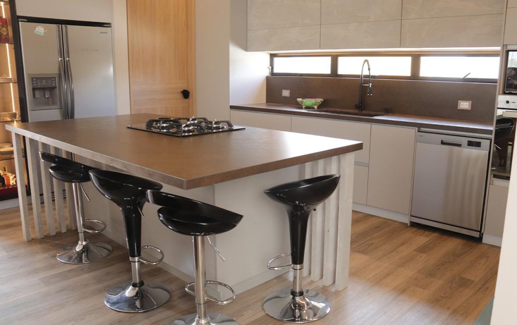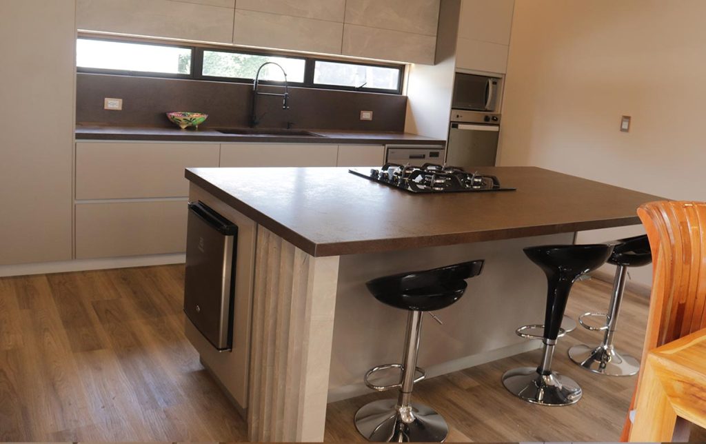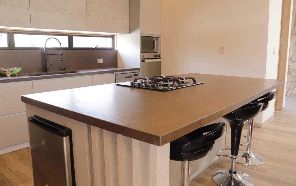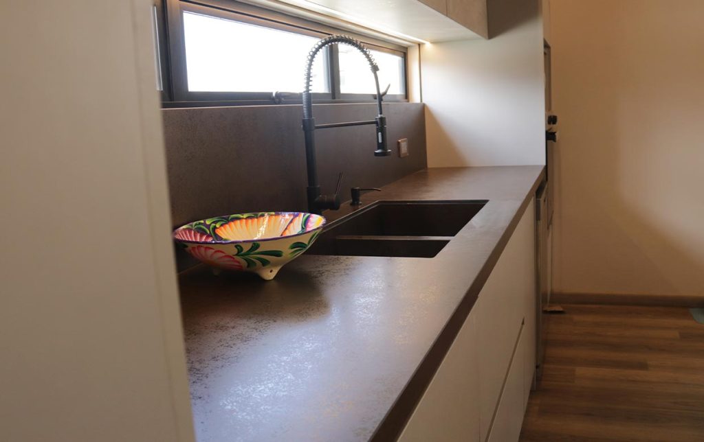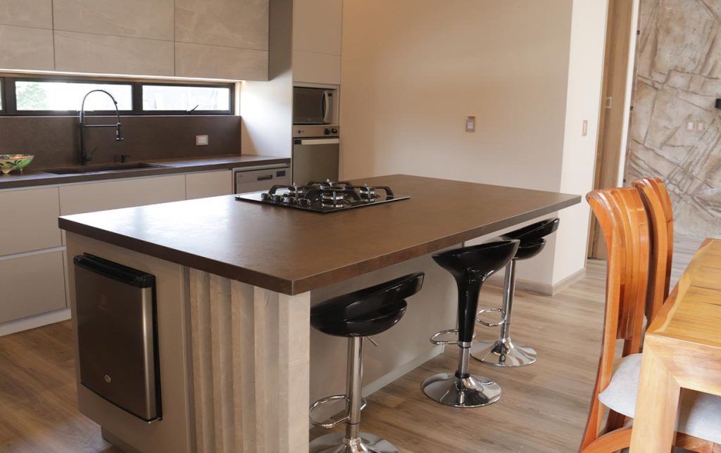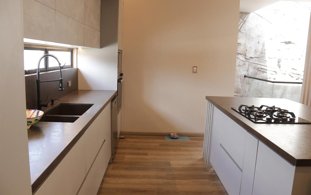 Cocina integral con mesón en sinterizado Martha Brown el cual tiene BRISOS OXIDADOS DANDOLE UN ESTILO UNICO Y RESALTANTE acercándose a un diseño industrial