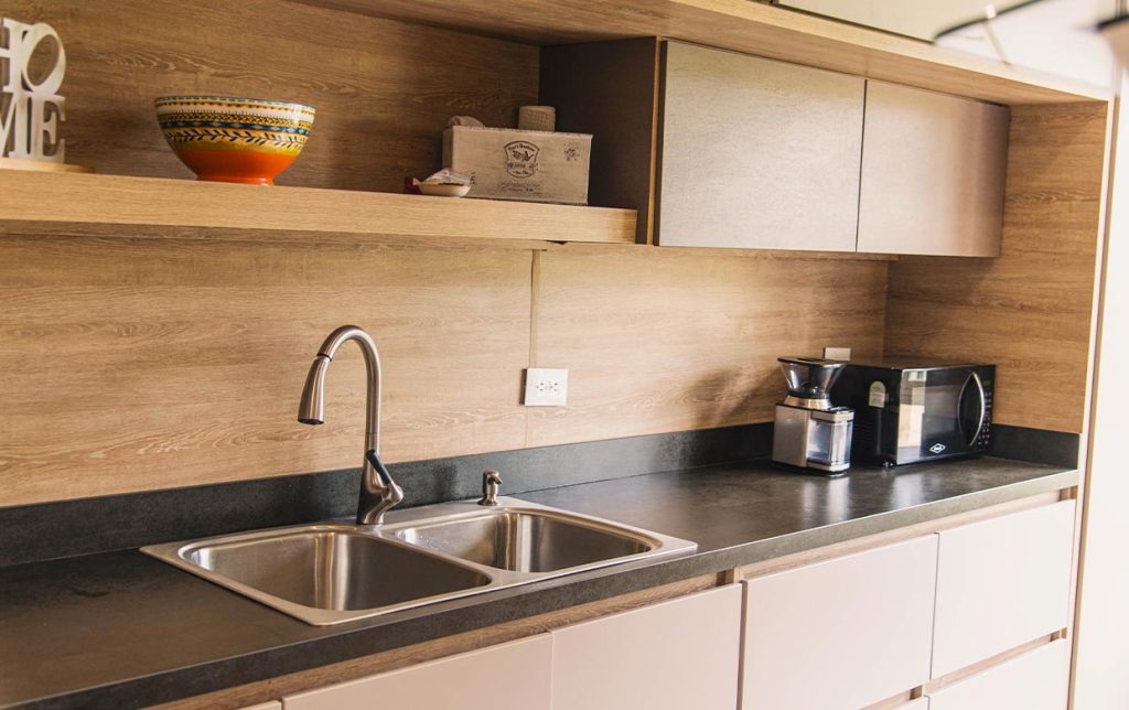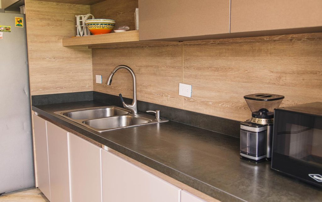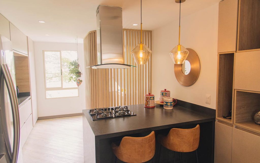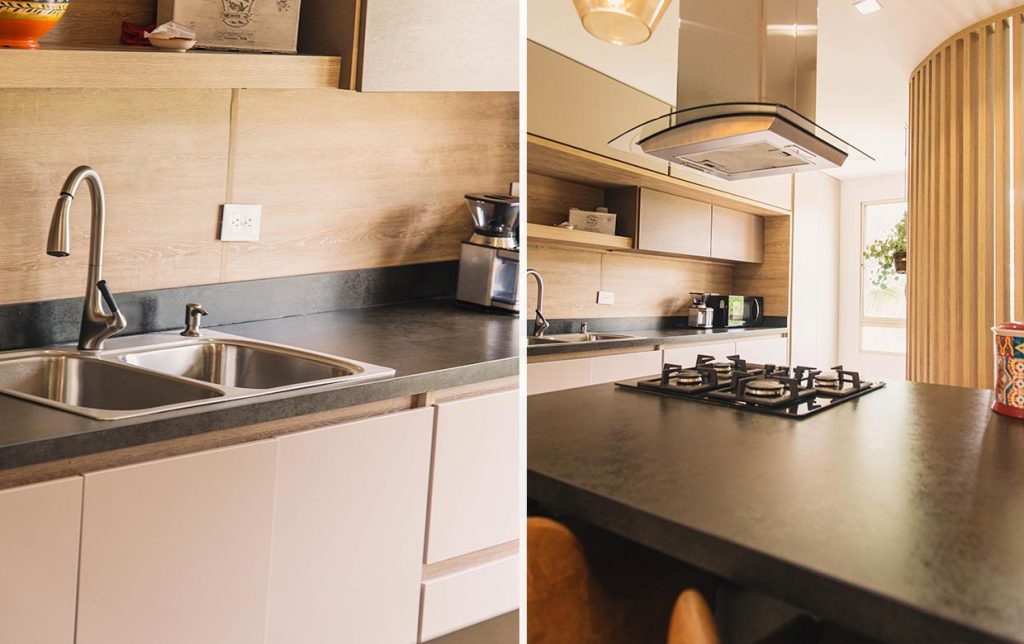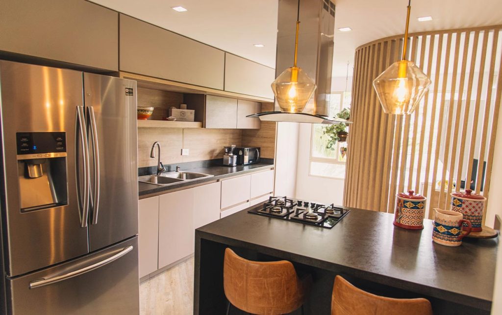 El sistema de apertura de puertas sin manijas hace parte de las tendencias actuales y otorga al espacio una especial sensación de pulcritud y minimalismo. El proceso de refrigerar, alistar y cocinar se puede realizar con practicidad gracias a la disposición inteligente de las áreas de trabajo. La Nevera, el lavaplatos y la estufa están ubicados pensando en su comodidad.
